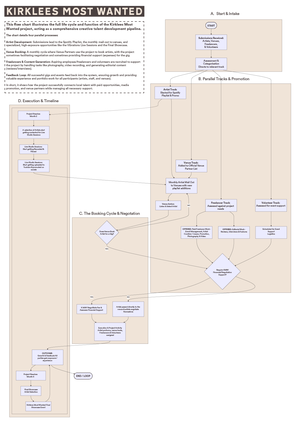 This flow chart illustrates the full life cycle and function of the Kirklees Most Wanted project, acting as a comprehensive creative talent development pipeline. The chart details four parallel processes: Artist Development: Submissions lead to the Spotify Playlist, the monthly mail-out to venues, and specialized, high-exposure opportunities like the Vibrations Live Sessions and the Final Showcase. Venue Booking: A monthly cycle where Venue Partners use the project to book artists, with the project sometimes facilitating negotiation and sometimes providing financial support (expenses) for the gig. Staff & Content Generation: Aspiring employees/freelancers and volunteers are recruited to support the project by handling tasks like photography, video recording, and generating editorial content (reviews/interviews). Feedback Loop: All successful gigs and events feed back into the system, ensuring growth and providing valuable experience and portfolio work for all participants (artists, staff, and venues). In short, it shows how the project successfully connects local talent with paid opportunities, media promotion, and venue partners while managing all necessary support.